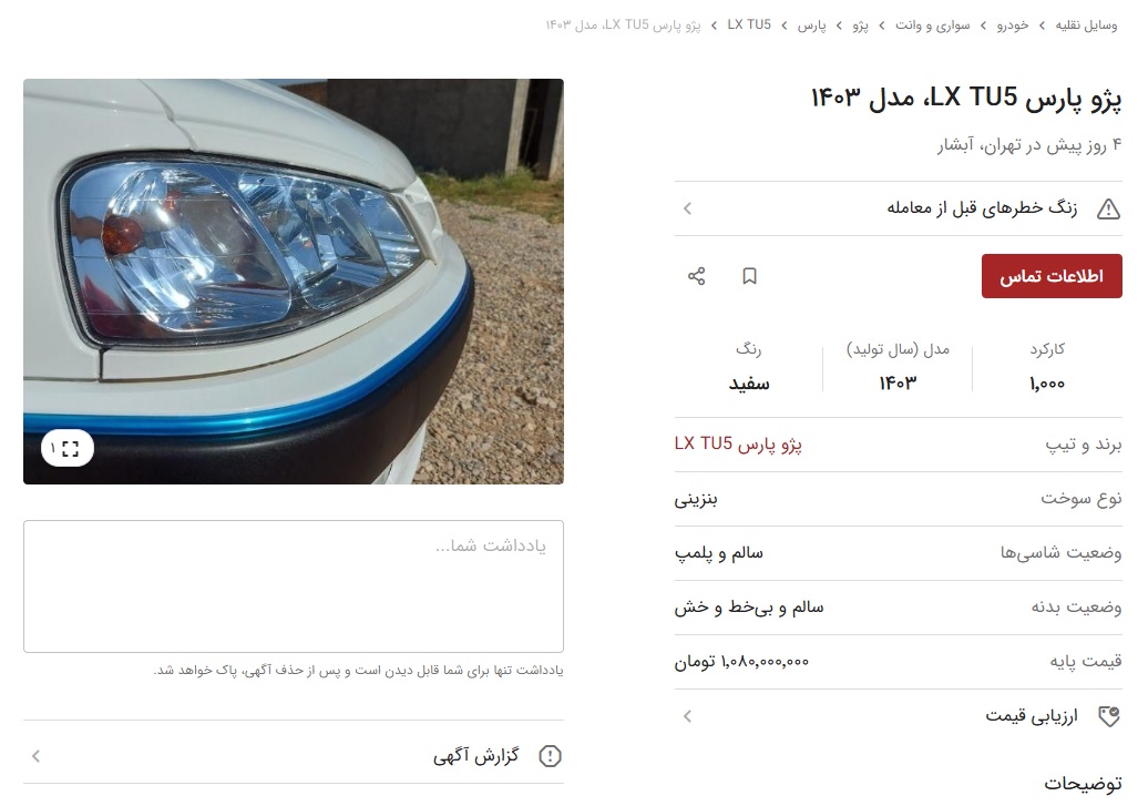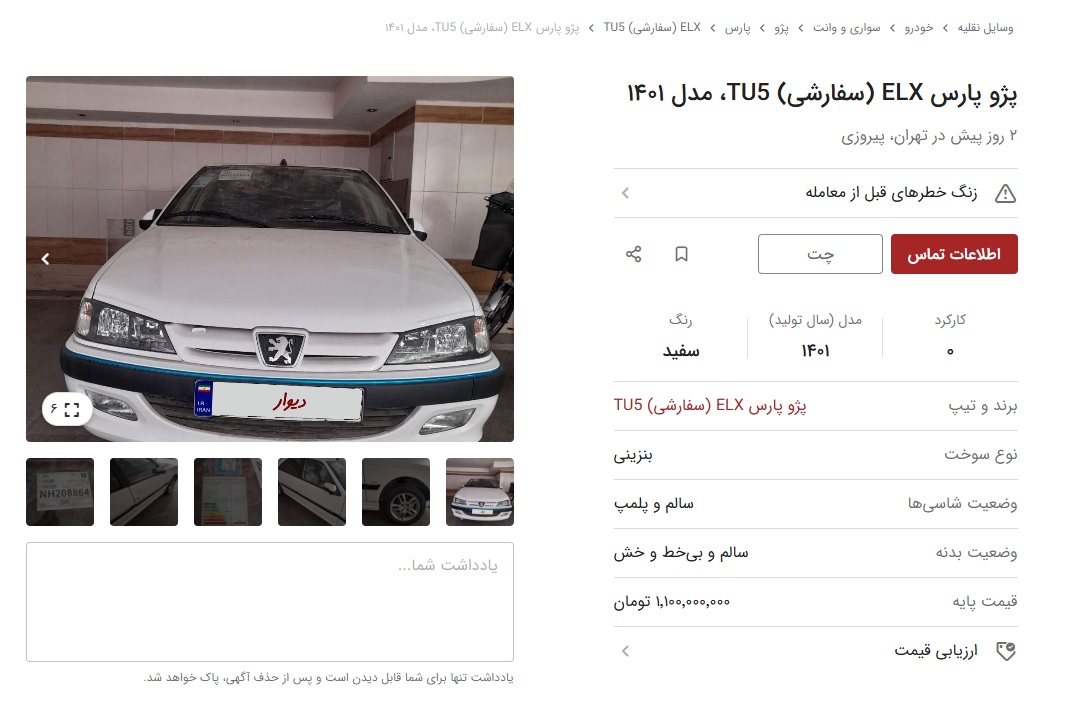 گروه اقتصادی: قیمت پژو پارس سال سفارشی روز پنجشنبه اول آذر توسط برخی از فروشندهها بیش از یک میلیارد تومان اعلام میشود.به گزارش قیمت ۳۶۰؛ پژو پارس سال سفارشی در آگهیهای دیوار و شیپور حتی تا یک میلیارد و ۱۰۰ میلیون قیمت خورده.